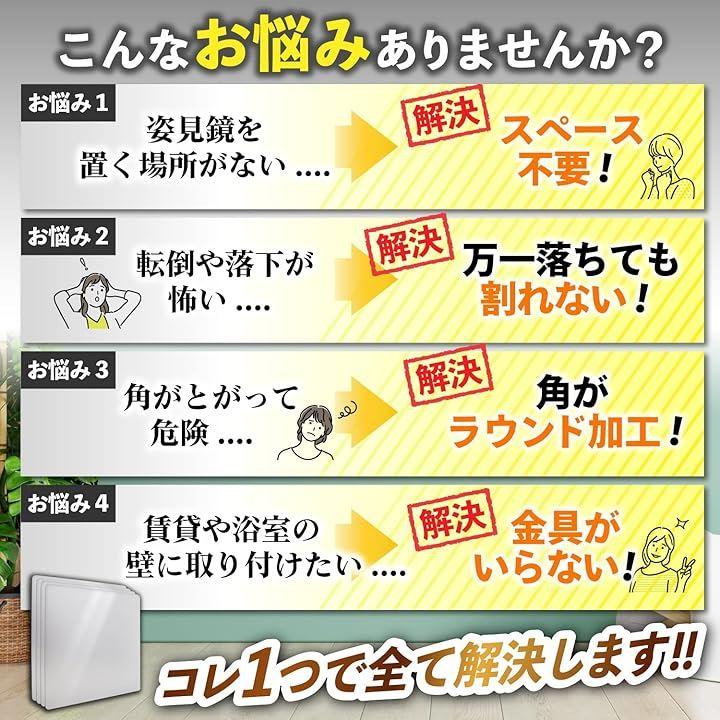 「皆様のお悩み解決」クローゼットのドアに貼りたい、落下して飛散するのが怖い、とがった角でけがをしそう、賃貸住宅に壁掛け鏡を設置したいけどできない、などお悩みと不安を解決する鏡です。
