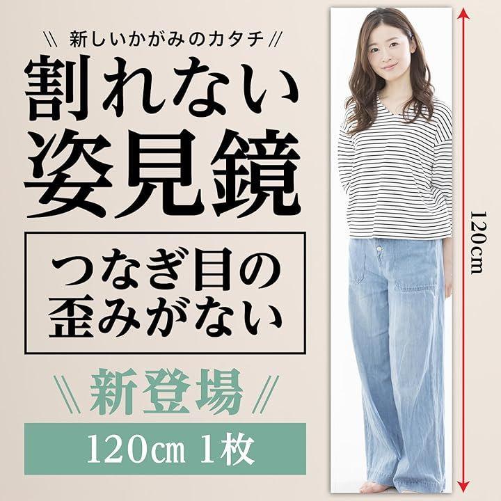 「新登場、1枚で120cm」お客様のご要望に答え、一枚で姿見に使える大きいサイズが新登場。つなぎ目がないので貼りやすくつなぎ目のずれがありません。