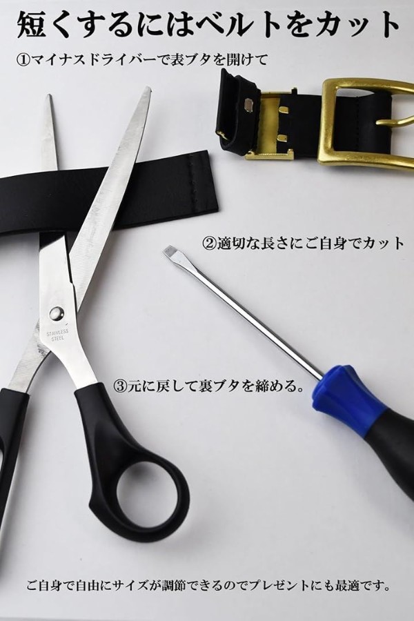 「ウエスト97cmまで対応(5個穴の真ん中で留める場合)」ご自身で簡単にカットしてサイズ調節が可能。