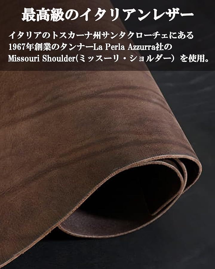 イタリアのトスカーナ州サンタクローチェにある1967年創業のタンナーLa Perla Azzurra社のミッスーリ・ショルダーを使用しています。
