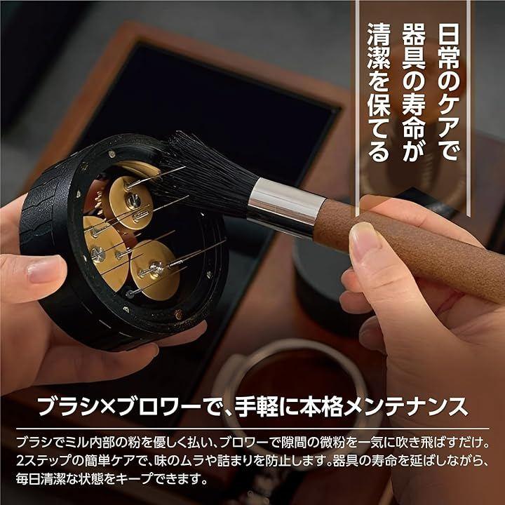 ブラシでミル内部の粉を優しく払い、ブロワーで隙間の微粉を一気に吹き飛ばすだけ。