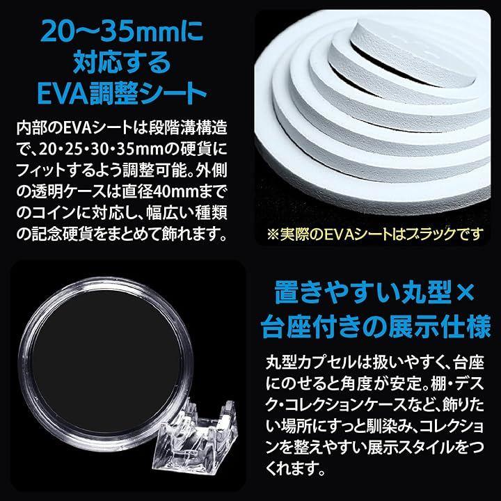 カプセル内部のEVAシートは段階溝構造で、直径20・25・30・35mmの硬貨に対応します。