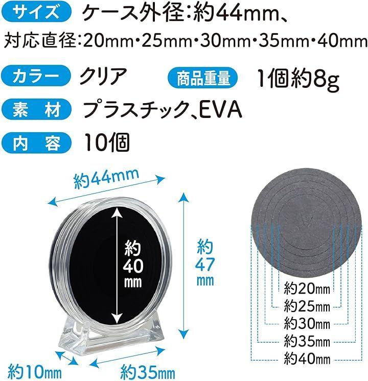 「サイズ」 ケース外径:約45mm、対応直径:20mm・25mm・30mm・35mm・40mm 「カラー」 クリア 「素材」 プラスチック、EVA 「商品重量」 1個約8g 「内容」 10個