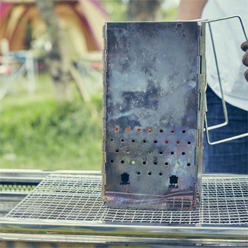 上昇気流を利用して誰でも簡単に炭おこしが可能。コンパクトに収納できるステンレス製チャコールスターター。413Hガソリンバーナーでも使いやすい四角い形状。コンパクトに折りたたんで持ち運びできる。キャリーケース付き。