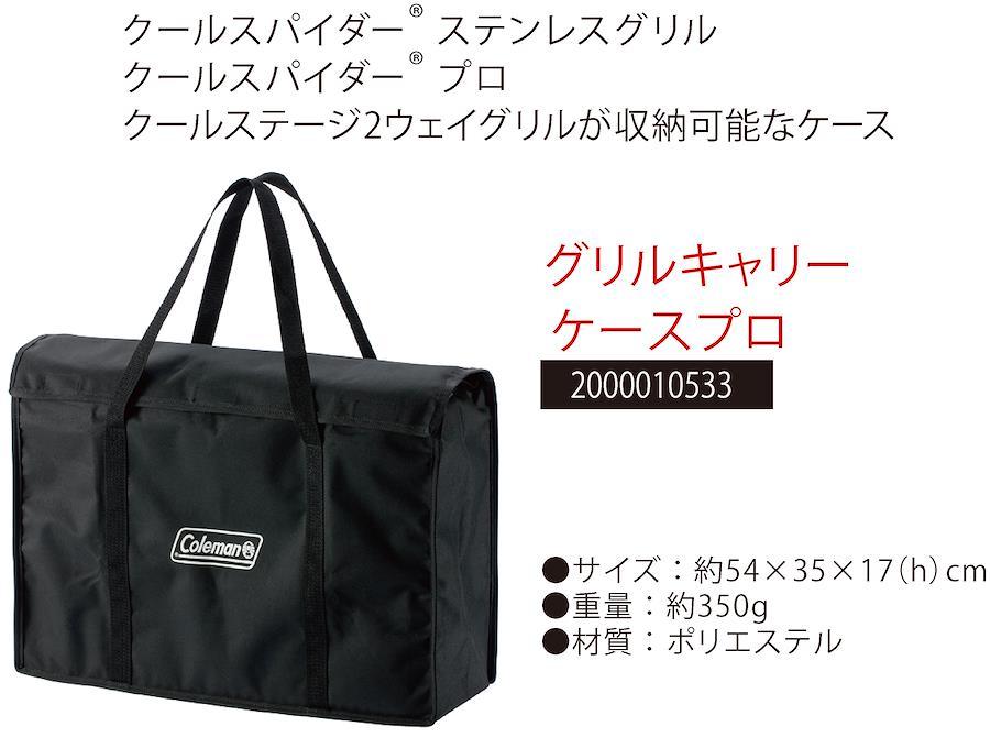 クールステージ2ウェイグリルが収納可能なケースサイズ:(プロL)約76×35×17(h)cm(プロ)約54×35×17(h)cm重量:(プロL)約500g(プロ)約350g材質:ポリエステル型番:2000010533