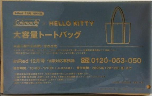 JAN等:商品名:Coleman HELLO KITTY 大容量トートバッグ InRed 2025年 12月号 特別付録属性:本詳細:状態:未開封品その他:圧縮可。この商品は出荷時にメール便系の3辺規格内へ収めるために、一旦開封したり、外箱等を破棄して中身のみを発送する場合があります。また圧縮にて若干型崩する場合もございます。