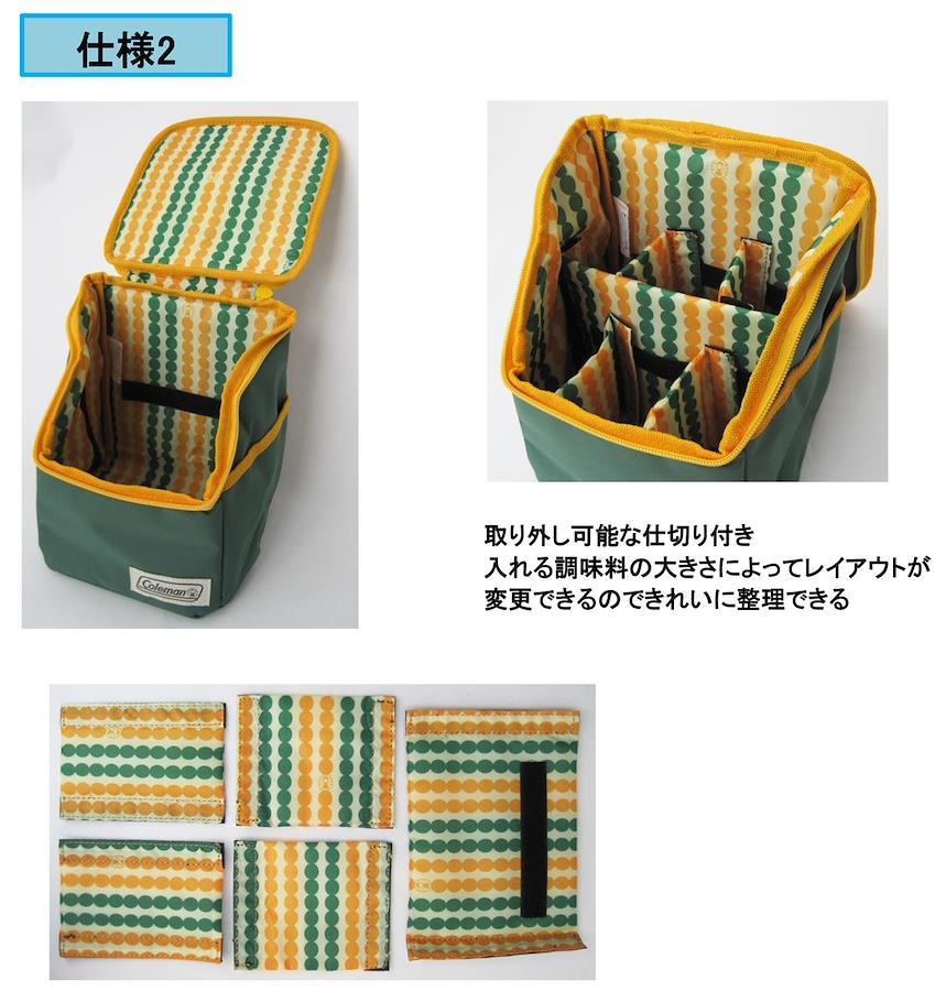 調味料を安心して持ち出せるパット入り調味料ケース。おしゃれな裏地付きの収納ケース。さまざまなボトルサイズに対応できる仕切付き。便利なポケット付き。