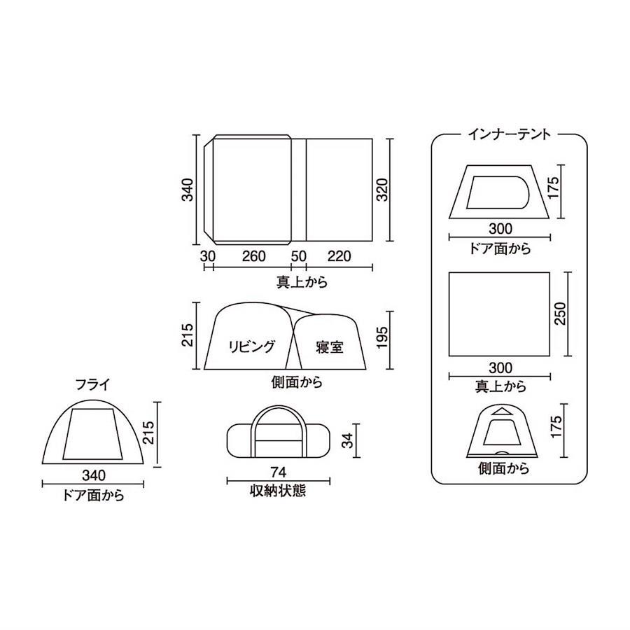 ●耐水圧:【フライ】約3000mm 【寝室】約2000mm 【リビング】【フロア】約2000mm ルーフ/約3000mm●定員:4~5人用●インナーサイズ:約300×250×175(h)cm●本体サイズ:約560×340×215(h)cm●収納時サイズ:約径34×74cm●重量:約19.5kg●材質:【フライ】75D ポリエステルタフタ(ダークルーム、UVPRO、PU防水、シームシール)【インナー】68Dポリエステルタフタ 【フロア】210Dポリエステルオックスフォード(PU防水、シームシール)【ポール】(リビング)アルミ合金約o16mm(寝室)アルミ合金約径14.5mm(リッジ)アルミ合金 約径11mm(キャノピー)スチール約径19mm(180cm)●仕様:キャノピー、メッシュドア、ベンチレーション、メッシュポケット、コード引き込み口、サイドウィンドウ、ランタンフック、吊り下げ式インナーテント●付属品:ルーフフライ、キャノピーポール×2、ペグ、ロープ、ハンマー、収納ケース