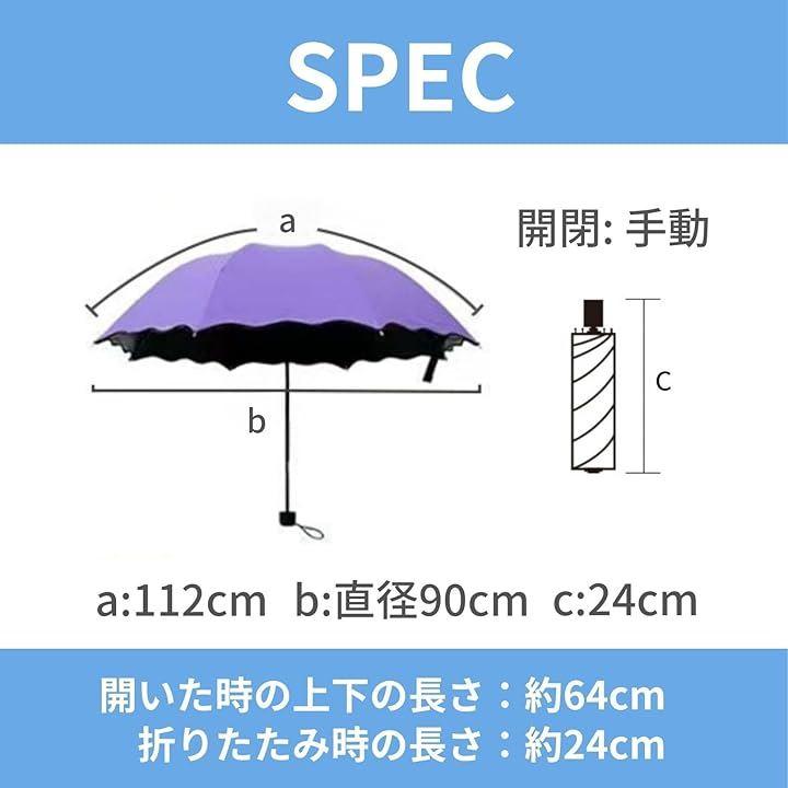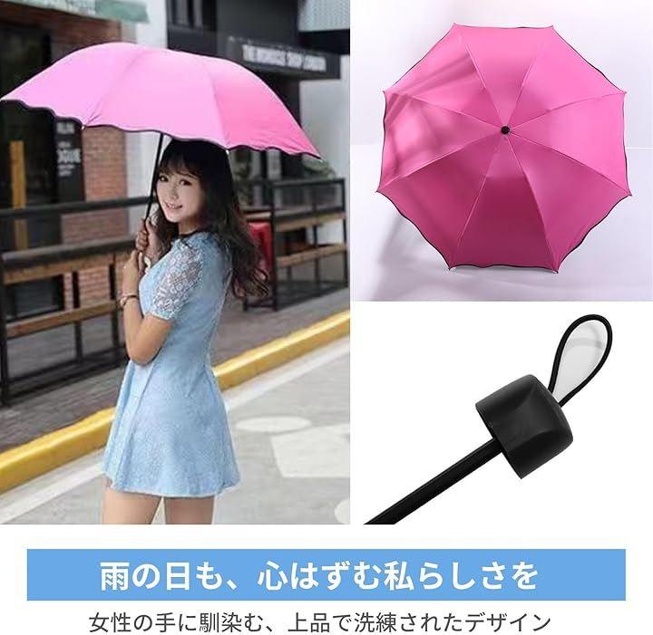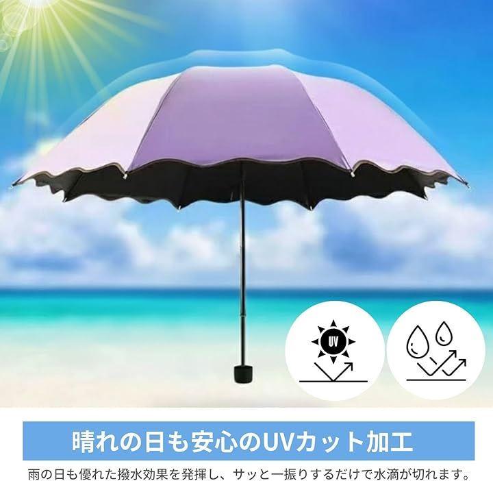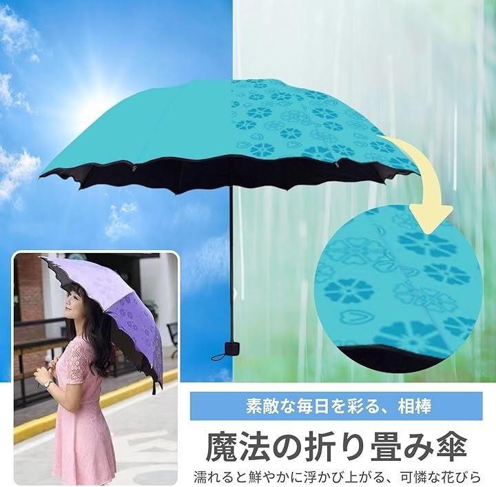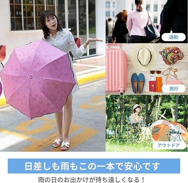 「ユニークな色変化デザイン」 この折りたたみ傘は、雨に濡れると表面の花びら模様が鮮やかに浮かび上がる変色プリント仕様。