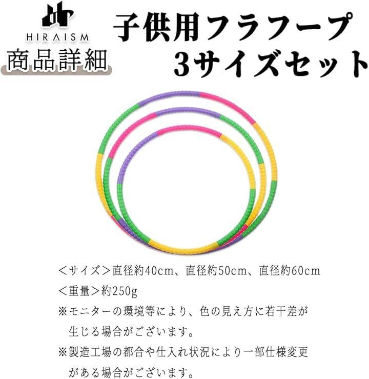 「商品内容」子供用フラフープ3サイズセット <サイズ>直径約40cm、直径約50cm、直径約60cm <重量>約250g *モニターの環境等により、色の見え方に若干差が生じる場合がございます。