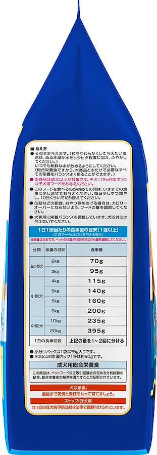 たんぱく質20.0%以上、脂質7.0%以上、粗繊維4.0%以下、灰分9.0%以下、水分20.0%以下、カルシウム0.8%以上、リン0.6%以上、リノール酸1.0%以上