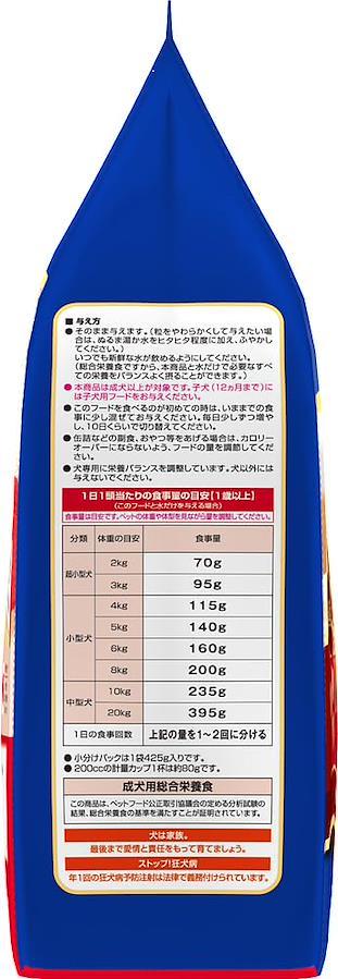 たんぱく質20.0%以上、脂質7.0%以上、粗繊維4.0%以下、灰分9.0%以下、水分20.0%以下、カルシウム0.8%以上、リン0.6%以上、リノール酸1.0%以上