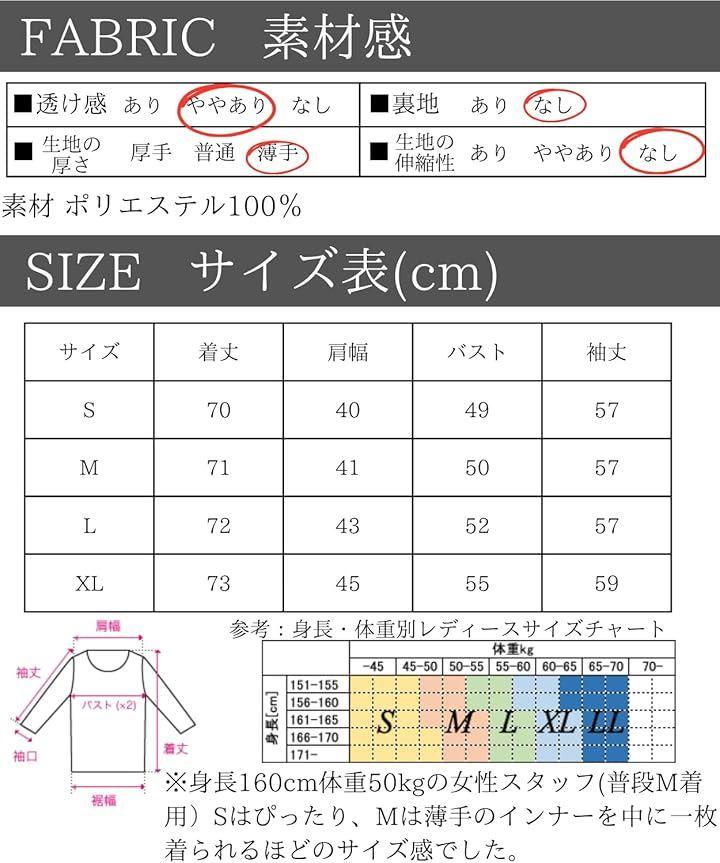 「素材」ポリエステル100% 「カラー」1デザイン(ベージュ)「サイズ(cm)」S着丈/70 肩幅/40 バスト/49 袖丈/57 M着丈/71 肩幅/41 バスト/50 袖丈/57 L着丈/72 肩幅/43 バスト/52 袖丈/57 XL着丈/73 肩幅/45 バスト/55 袖丈/59