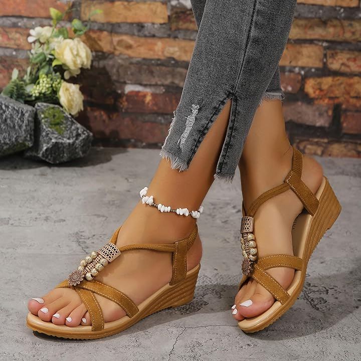 Comfortable Wedge Sandals with 5cm Heel, Ethnic Style, Lightweight, for Women, Spring, Summer, and Autumn, Back Ankle Strap, Open Toe, Asian Style Fashion, Wedge Platform