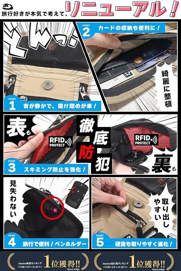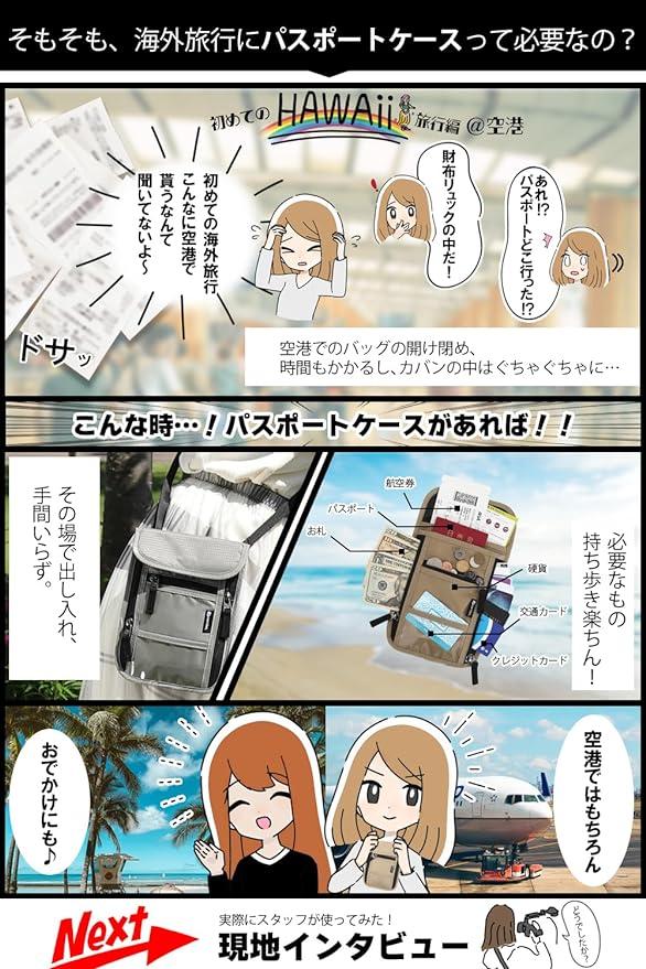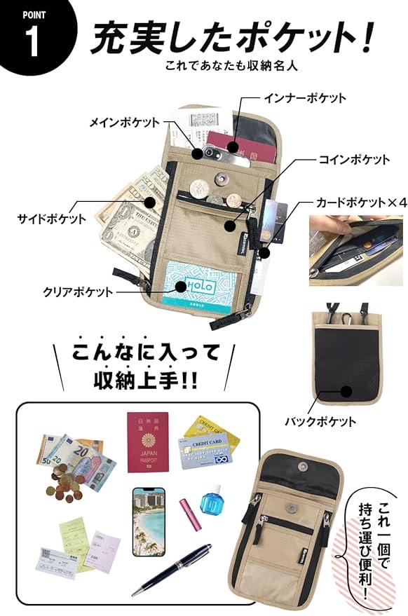 ■商品説明旅行先のちょっとしたお出かけは、これ1つあればすべて収納できます!?海外旅行が好きな弊社企画担当が考案しました!実際に使用した方々のお声を元に5つのリニューアルを実現しました。 .【磁石を使った静かな開閉!】『パスポートケースを開けるときのマジックテープの音が恥ずかしい、、』と従来品にて当スタッフも悩んでいました。そこで、マグネットボタンにすることで静かに開閉できるパスポートカバーが完成!?【スキミングからしっかり守ります!】正面のみRFID素材を使用しているものが従来品には多いですが、当製品は背面もRFID素材を採用し、スキミング防止を強化!大事な個人情報をしっかり守るセキュリティーポーチです! . 【大容量11ポケット】「こだわり」のポケットが11個もあるので大容量!整頓しやすいパスポートケースになりました。?【ペンホルダー付き】旅行では何かと書くものが必要な時がありますよね。。当商品はメインポケットにペンホルダーがついているので急にペンが必要になった時もさっと取り出せます!?【小銭が取り出しやすくなりました!】コインケースのポケットを浅くしております。もう従来品のように、「コインケースの底が深くて小銭を取り出すのに一苦労、、、」なんてこともありません! .【重量116g!きゅうり1本と同じ!】軽量化の実現で旅先での首や肩への負担を軽減し、従来品よりも持ち運びやすいものになりました。? 【 サイズ 】 全長 21.3cm ショルダー長さ76cm~138cm 【 付属品 】・カラビナ ストラップ?【5色のカラー展開】現在カラーバリエーションとしてブラック、チャコール、ネイビー、グレー、ベージュの5色。 .【 プレゼント 贈り物 としても選ばれております】岡山県メーカーcomfoxがプロデュースしたオリジナルパスポートケース をいつもと違った プレゼント ギフトとして是非ご活用ください!【comfoxは商標登録済みの「岡山県ショップ comfox 」オリジナル商品です】類似品(デザイン、カラー)にご注意ください。他社製品とは品質・フォローに大きな違いがございます。【どんな些細なことでもお気軽にお問い合わせくださいませ】