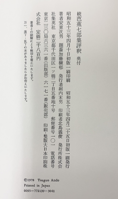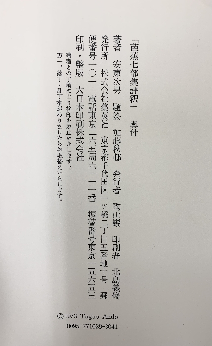 Commentary on Basho's Seven Collections (2-volume set), Shueisha, by Tsuguo Ando, 1973-