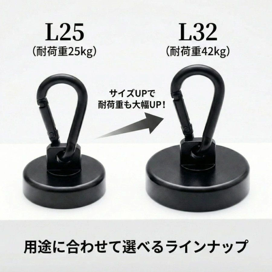 マグネットフック 強力 超強力 磁石フック ネオジム磁石 ネオジム マグネット カラビナ フック 4個セット L32 直径32mm 耐荷重42kg ブラック 黒 防錆 工具収納 ガレージ 倉庫 整理 収納 玄関 冷蔵庫 キッチン スチールラック H鋼 金属 壁掛け 吊り下げ 磁力 強力磁石