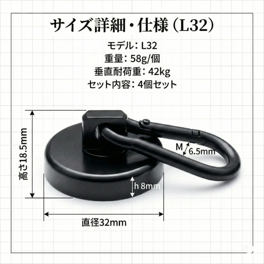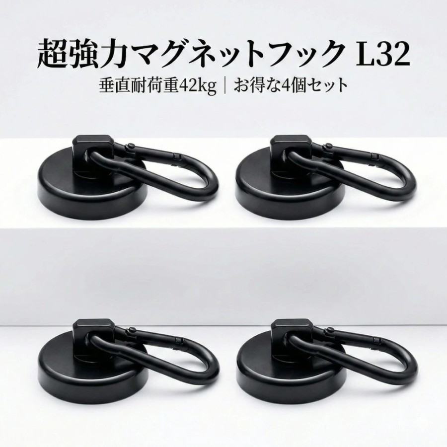 本商品は、ネオジム磁石内蔵の超強力マグネットフック L32(直径32mm)。鉄製面に“置くだけ”でガッチリ固定でき、工具やバッグ、小物の吊り下げ収納に大活躍します。お得な4個セットなので、キッチン・玄関・ガレージ・倉庫など複数箇所の整理整頓が一気に進みます。