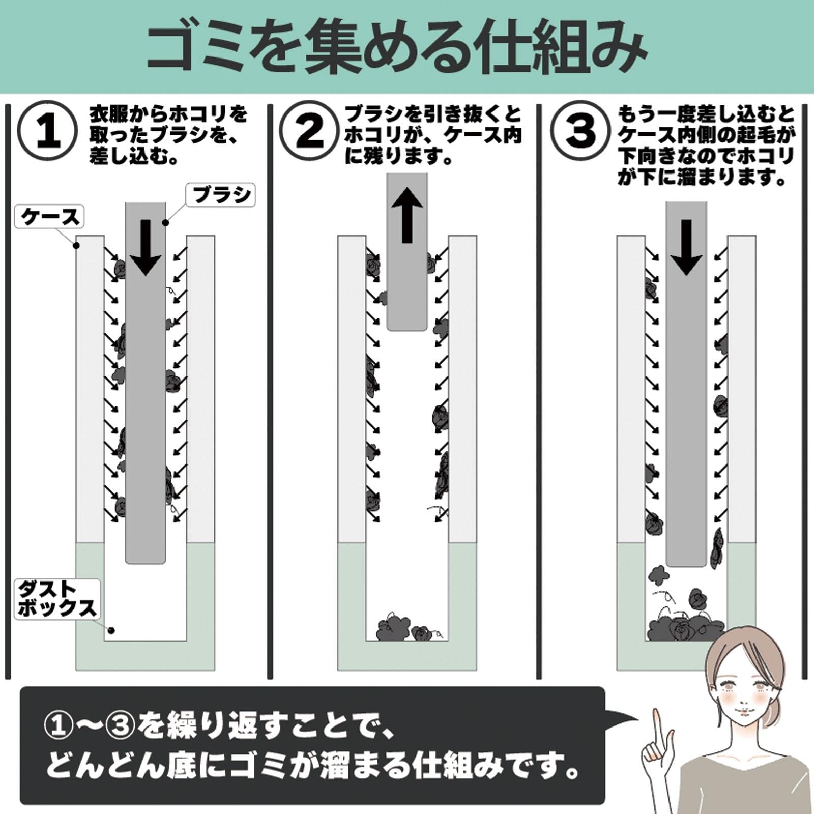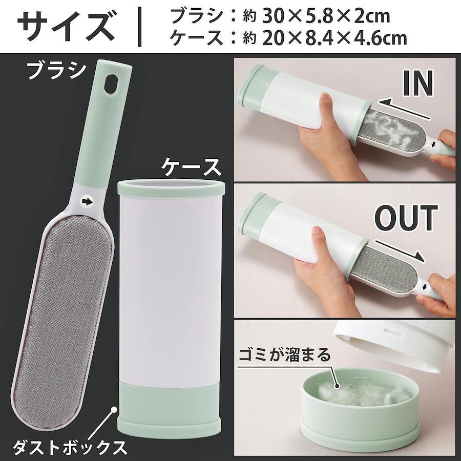 生地を傷めにくいクッションタイプの両面ブラシ設計で、使用後のお手入れは、本体ブラシをケースに入れて引き抜くだけ。