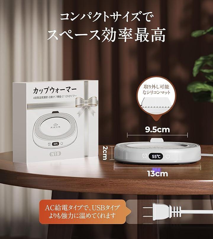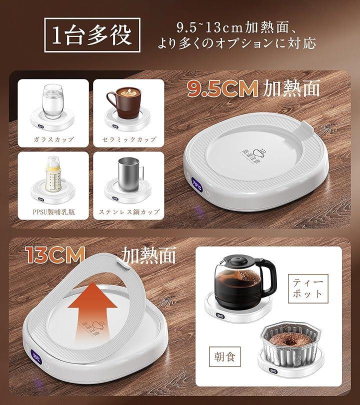 「高コスパ。多様なカップに対応」マグカップウォーマーは、さまざまなユーザーのニーズに応えるために取り外し可能なシリコンマットを搭載、加熱プレートの直径を9.5cmと13cmに瞬時に切り替え可能です。
