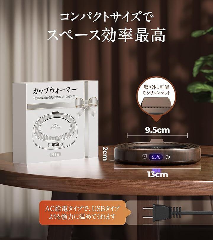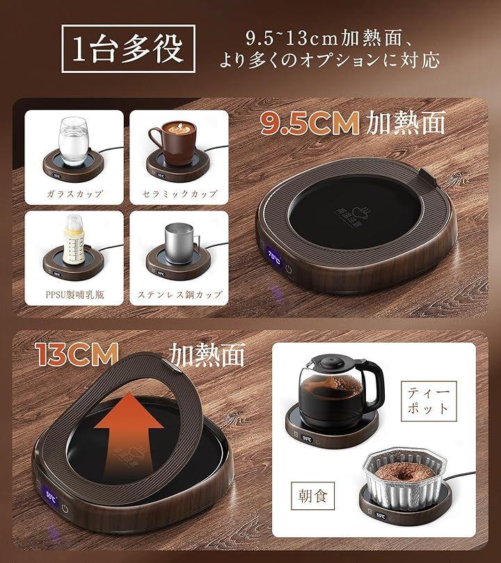 「高コスパ。多様なカップに対応」マグカップウォーマーは、さまざまなユーザーのニーズに応えるために取り外し可能なシリコンマットを搭載、加熱プレートの直径を9.5cmと13cmに瞬時に切り替え可能です。
