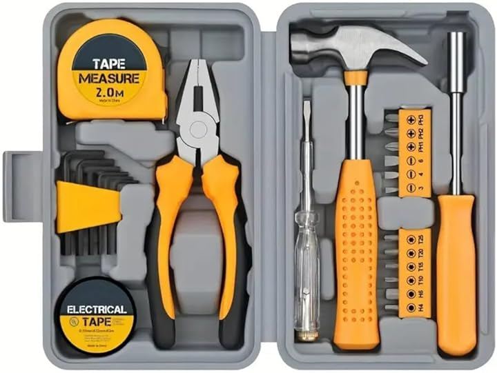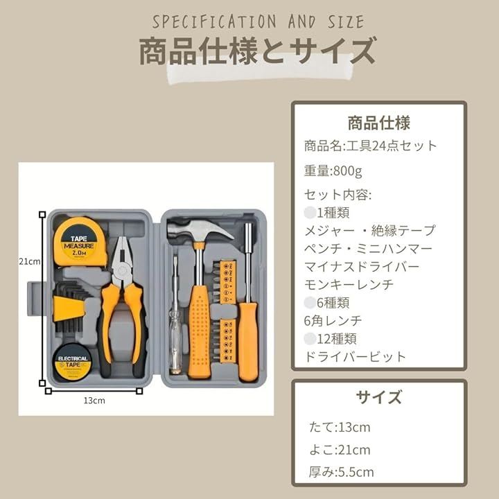 「商品内容」ミニハンマー(1個) メジャー(1個) モンキーレンチ(1個) ペンチ(1個) マイナスドライバー(1個) 6角レンチ(6種類) ドライバービット(12種類) 絶縁テープ(1個)