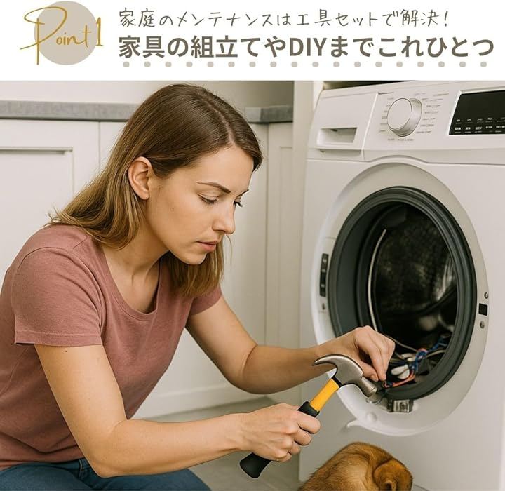 「初心者も安心。家庭のメンテナンスは工具セットで解決。」ドライバー・ペンチ・ハンマー・六角レンチ・メジャー・絶縁テープまで、日常生活で必要な工具をコンパクトに収納。