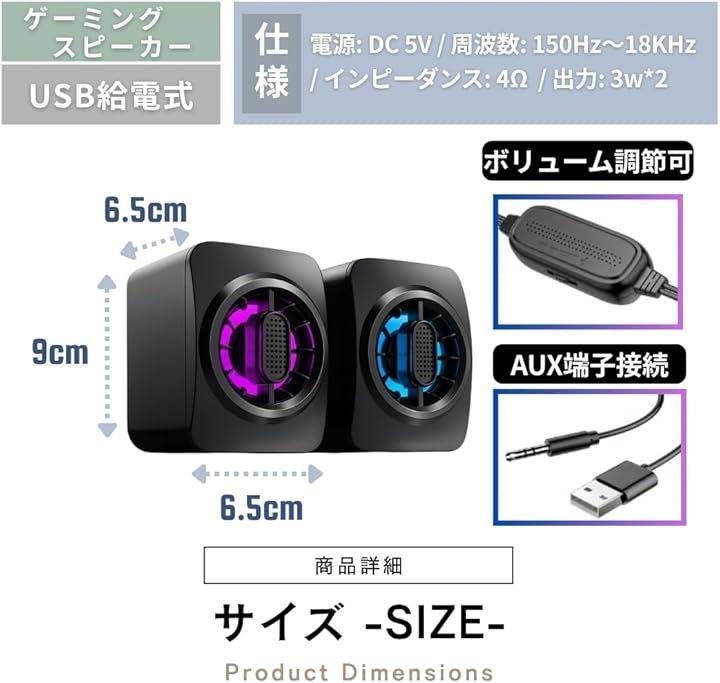 「商品内容」サイズ:高さ9cm 幅6.5cm 奥行6.5cm 電源方式:USB給電(type-A) 付属品:音量調節リモコン付き(ケーブル長さ142.5cm) インターフェース:3.5mmステレオ端子(AUX) *サイズ詳細は商品画像をご確認ください。