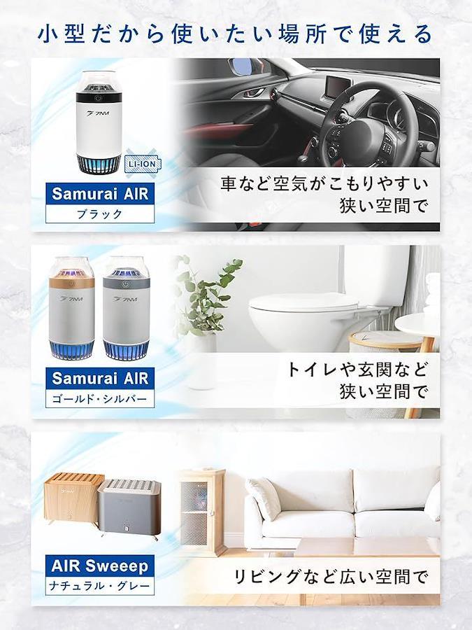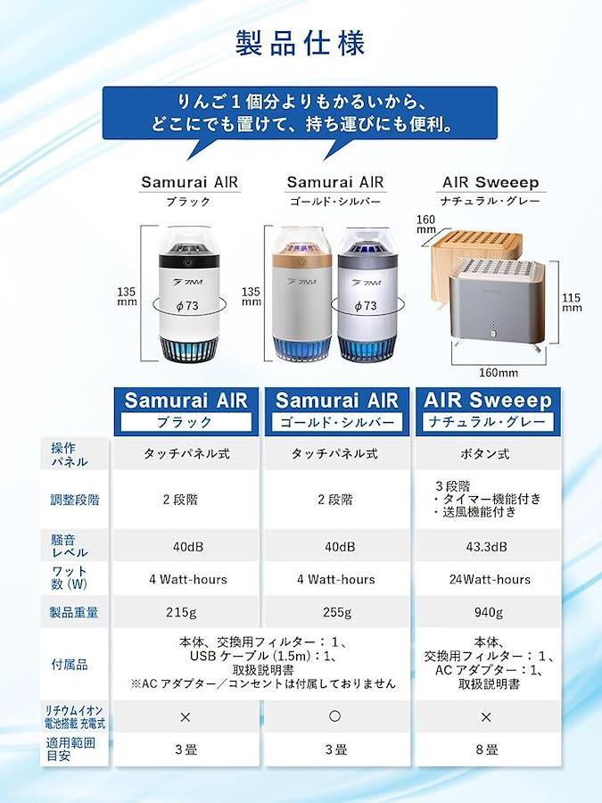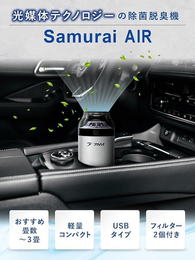 (2) SAMURAI AIRはコンパクトで強力な空気清浄機能を持ち、クラウドファンディングで548%の資金調達に成功した製品シリーズです。