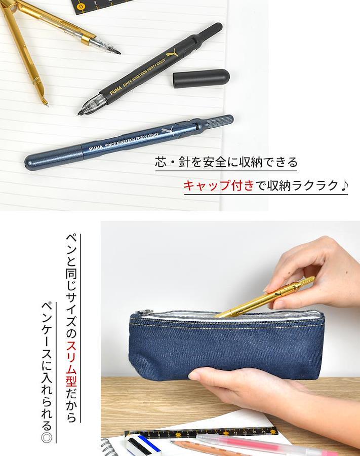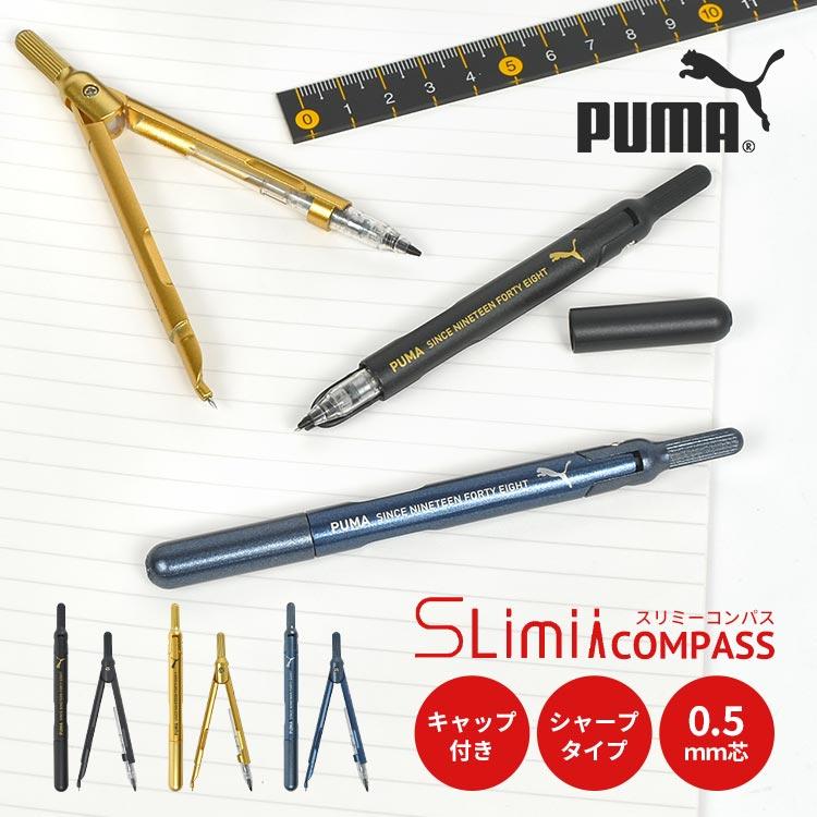 【スリミーコンパス】メタリック感がかっこいい機能的なPUMAのコンパスが登場!安定して円が描きやすい設計のスリム型。ノックなしで自動で芯が出るシャープペン付きで、市販のシャープ芯を入れて使えます。芯や針を安全に収納できるキャップもついているのでペンケースに入れて持ち歩けます◎