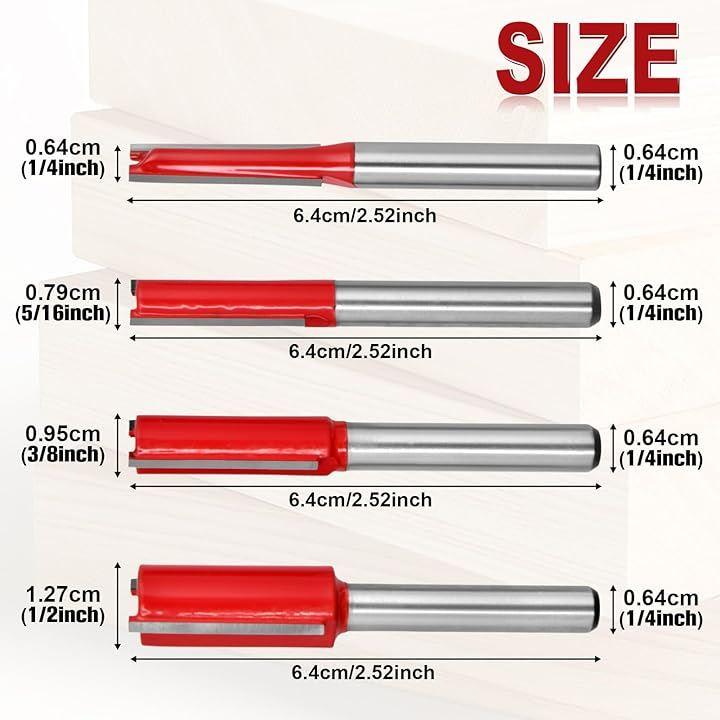 製品が含まれています:4個1/4インチシャンクプロの溝加工フライスカッターストレートカッター、1/4インチ、5/16インチ、3/8インチ、1/2インチの切断直径は、それぞれが簡単に保管し、運ぶための個々の保管ボックスが付属しています