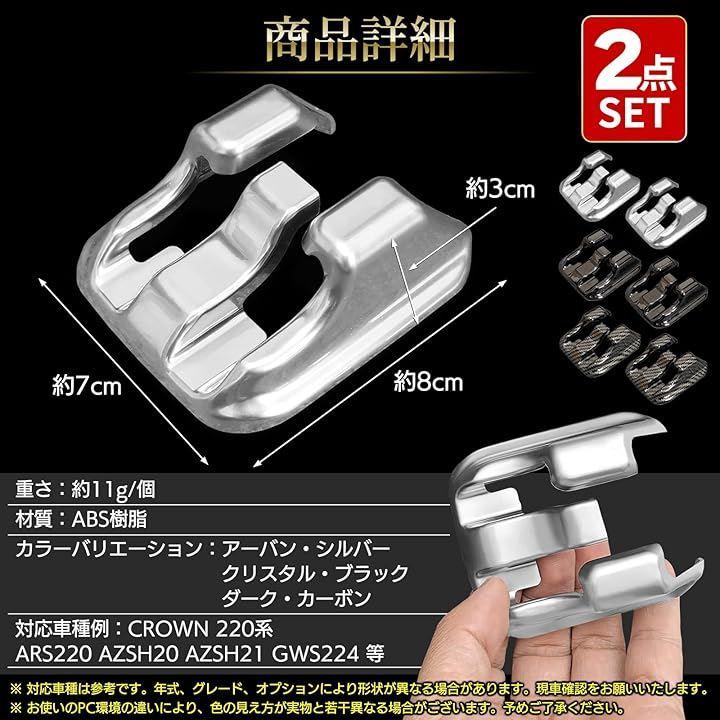 「商品詳細」サイズ:幅約7cm、奥行き約8cm、高さ約3cm 重さ:約11g/個 材質:ABS樹脂 カラーバリエーション:アーバン・シルバー/クリスタル・ブラック/ダーク・カーボン 対応車種例:CROWN 220系 ARS220 AZSH20 AZSH21 GWS224 等 *対応車種は参考です。