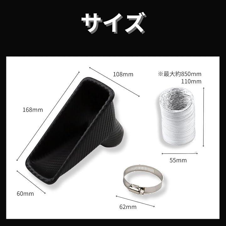 「セット内容と詳細仕様」セットにはエアインテークダクト本体、伸縮可能なフレキシブルアルミホース、取り付けバンドがセットされており、到着後すぐに取り付け作業を始めることができます。