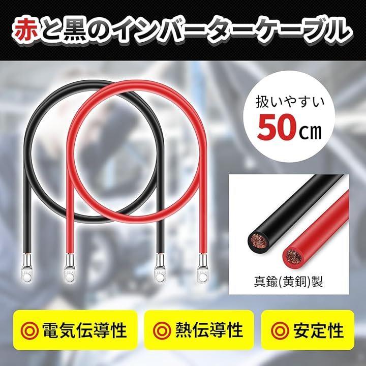 「適用範囲」50cm 16mm2インバーターケーブルには、正(赤)と負(黒)のバッテリーケーブルの2本セット。