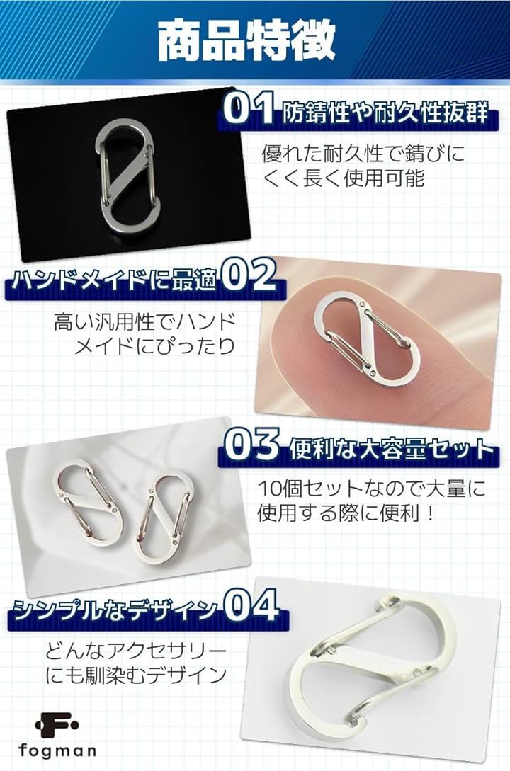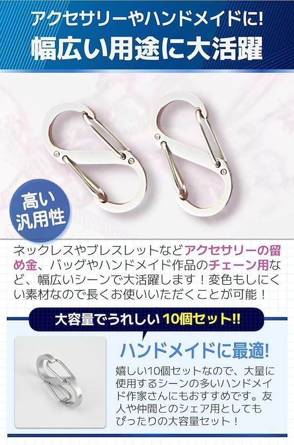 「商品特徴」(1)防錆性や耐久性抜群:優れた耐久性で錆びにくく長く使用可能/(2)ハンドメイドに最適:高い汎用性でハンドメイドにぴったり/(3)便利な大容量セット:10個セットなので大量に使用する際に便利。/(4)シンプルなデザイン:どんなアクセサリーにも馴染むデザイン