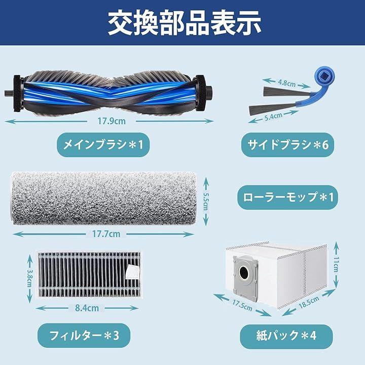 「パッケージ内容」エコバックス 消耗品セット:メインブラシx1枚、ローラーモップx1枚、交換用ゴミパックx4枚、フィルターx3枚、サイドブラシx6枚