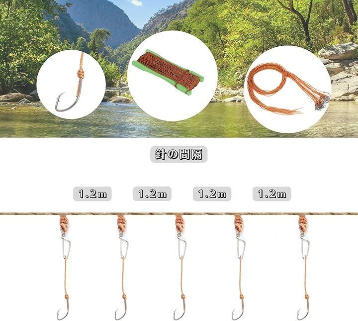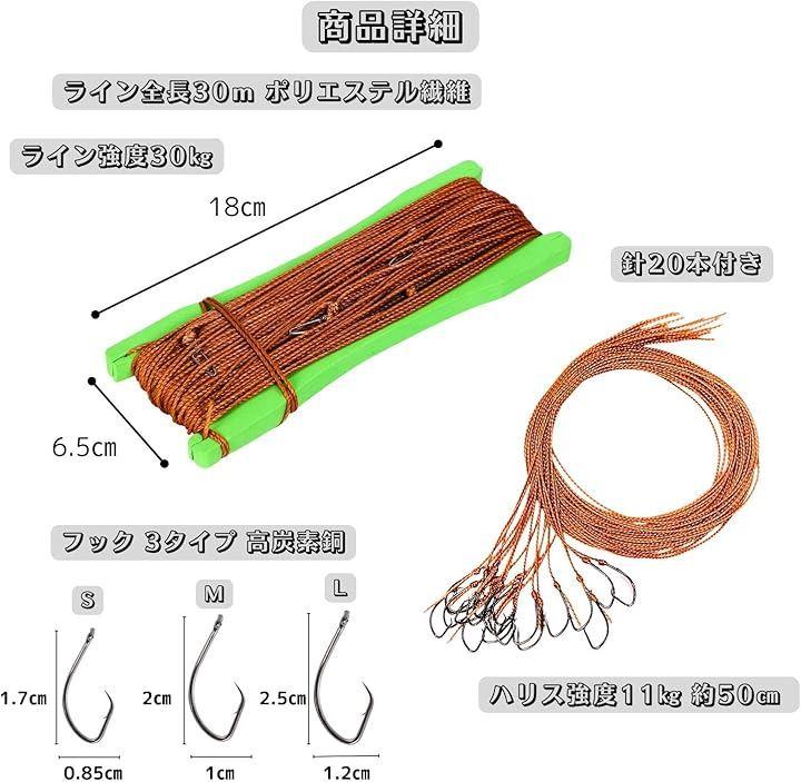 仕様:延縄の長さ: 30m フックの数: 20本 材質: 高炭素鋼(針)、ポリエステル(縄)