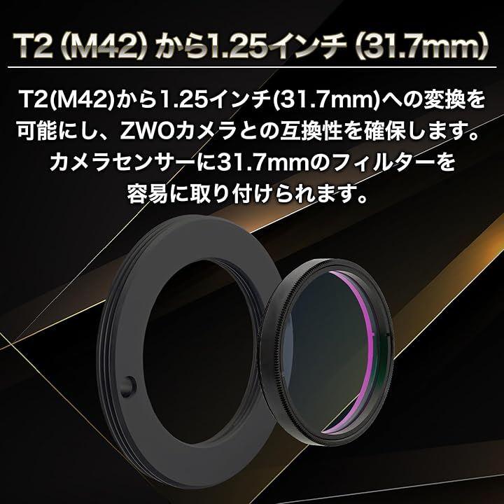 T2(M42)から1.25インチ(31.7mm)への変換を可能にし、ZWOカメラとの互換性を確保します。