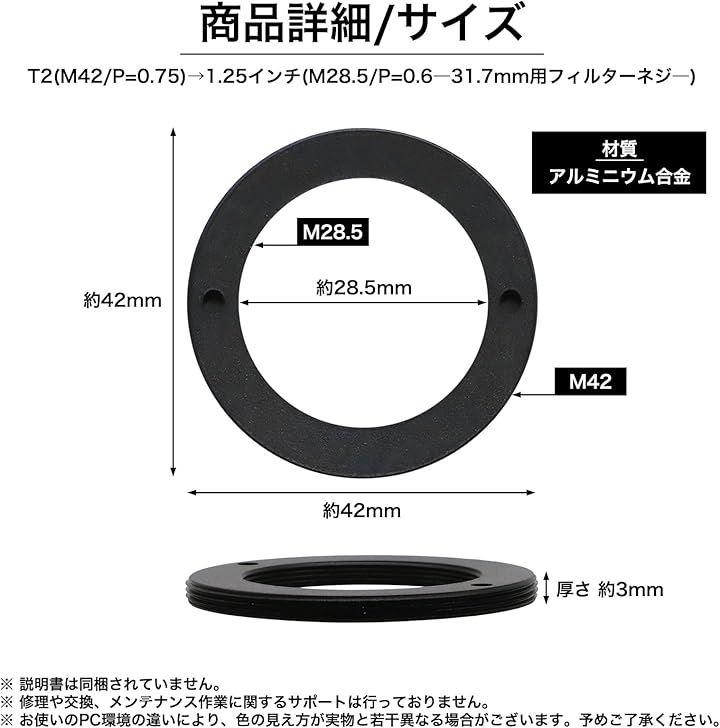「サイズ」T2(M42/P=0.75)>1.25インチ(M28.5/P=0.6―31.7mm用フィルターネジ―) 厚さ3mm 「材質」アルミニウム合金 *説明書は同梱されていません。