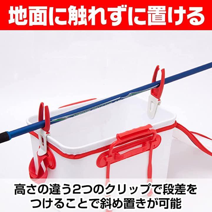 高さの違う2つのクリップで段差をつけることで斜め置きが可能になり、長めの竿でも穂先を地面に触れさせることなく置ける。