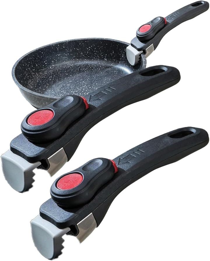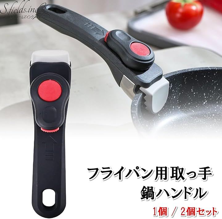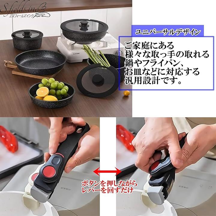 ボタンを押しながらレバーを回すだけのワンタッチで簡単に操作でき、鍋やフライパンに素早く取り付け・取り外しが可能なフライパン用取っ手です。