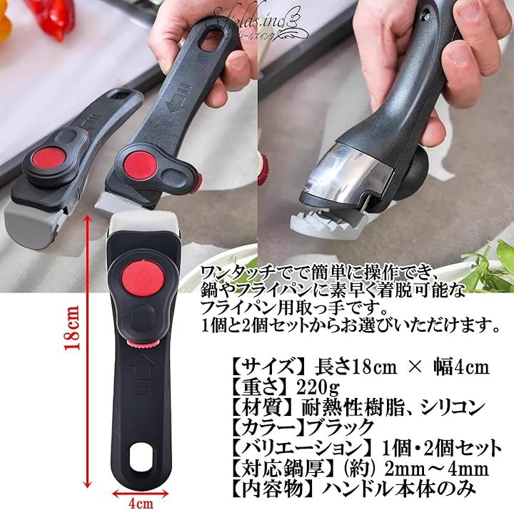 「サイズ」長さ18cm x 幅4cm 「重さ」220g 「材質」耐熱性樹脂、シリコン 「カラー」ブラック 「バリエーション」1個・2個セット 「対応鍋厚」(約) 2mm~4mm 「内容物」ハンドル本体のみ
