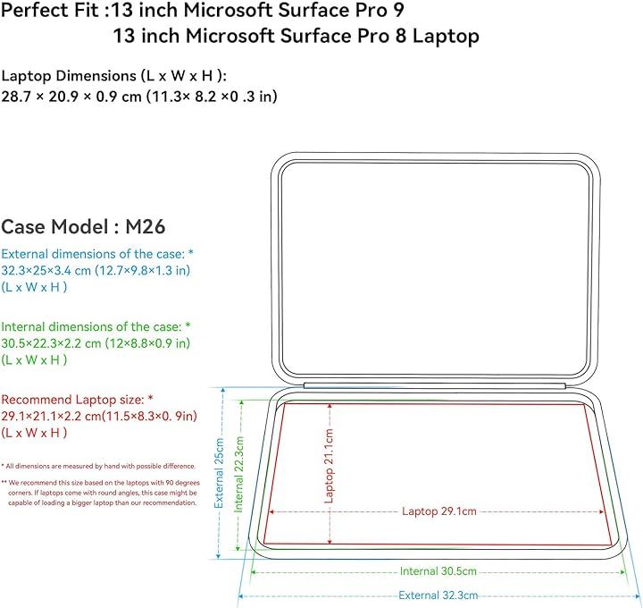 「モデル番号 : M26」ケースの外寸: 32.3x25.0x3.4 cm (12.7x9.8x1.3インチ)、ケースの内寸: 30.5x22.3x2.2 cm (12.0x8.8x0.9インチ)。