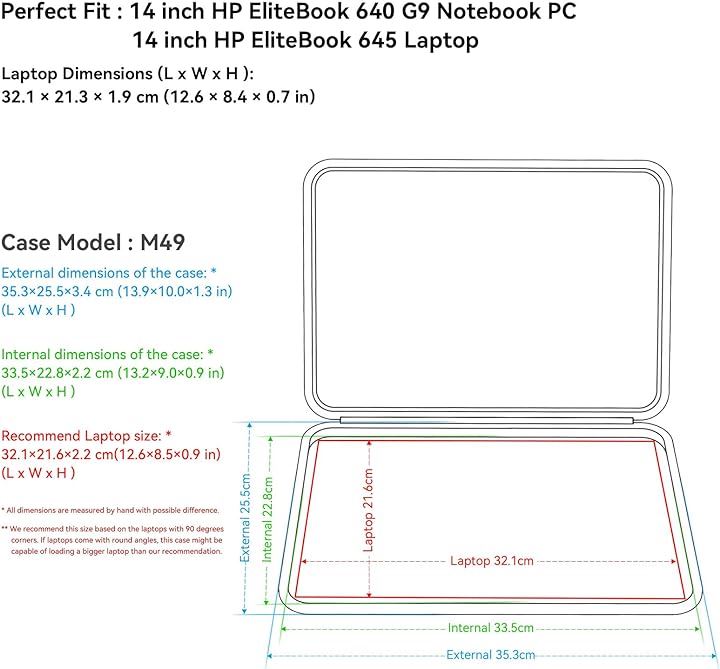 「モデル番号 : M49」ケースの外寸: 35.3x25.5x3.4cm(13.9x10.0x1.3インチ)、ケースの内寸: 33.5x22.8x2.2cm (13.2x9.0x0.9インチ)。