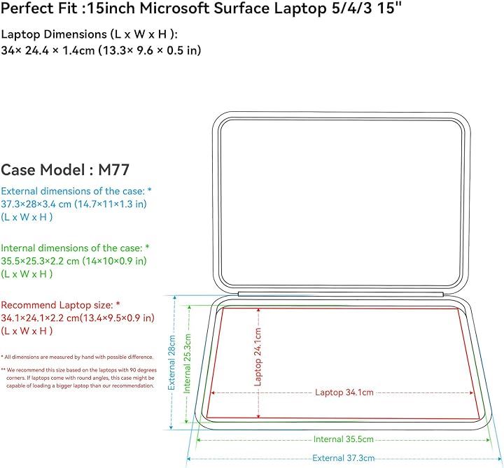 「モデル番号 : M77」ケースの外寸: 37.3x28x3.4 cm(14.7x11.0x1.3インチ)、ケースの内寸: 35.5x25.3x2.2 cm (14.0x10.0x0.9インチ)。