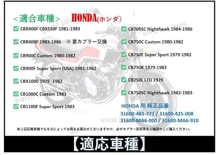 「適合車種例」 CBX400F CBX550F 1981-1983 CBR400F 1983-1986 * 要カプラー交換 CB900C Custom 1980-1982 CB900F Super Sport (USA) 1981-1982 CBX1000 1979 -1982 CB1000C Custom 1983 CB1100F Super Sport 1983 CB700SC Nighthawk 1984-1986 CB750C Custom 1980-1982 CB750F Super Sport 1979-1982 CB750K 1979-1982 CB750L LTD 1979 CB750SC Nighthawk 1982-1983 HONDA 用 純正品番 31600-461-771 / 31600-425-008 / 31600-MA6-000 / 31600-MA6-910 * 上記記載車種でも年式により異なる場合がありますので、必ず カプラー 形状 等をご確認くださいますようお願い致します。