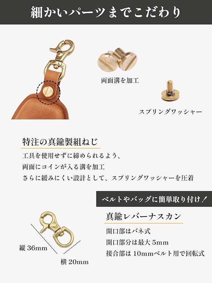 「真鍮金具使用」:特注の真鍮組ねじと真鍮ナスカンは、高い耐久性と美しい経年変化が魅力。