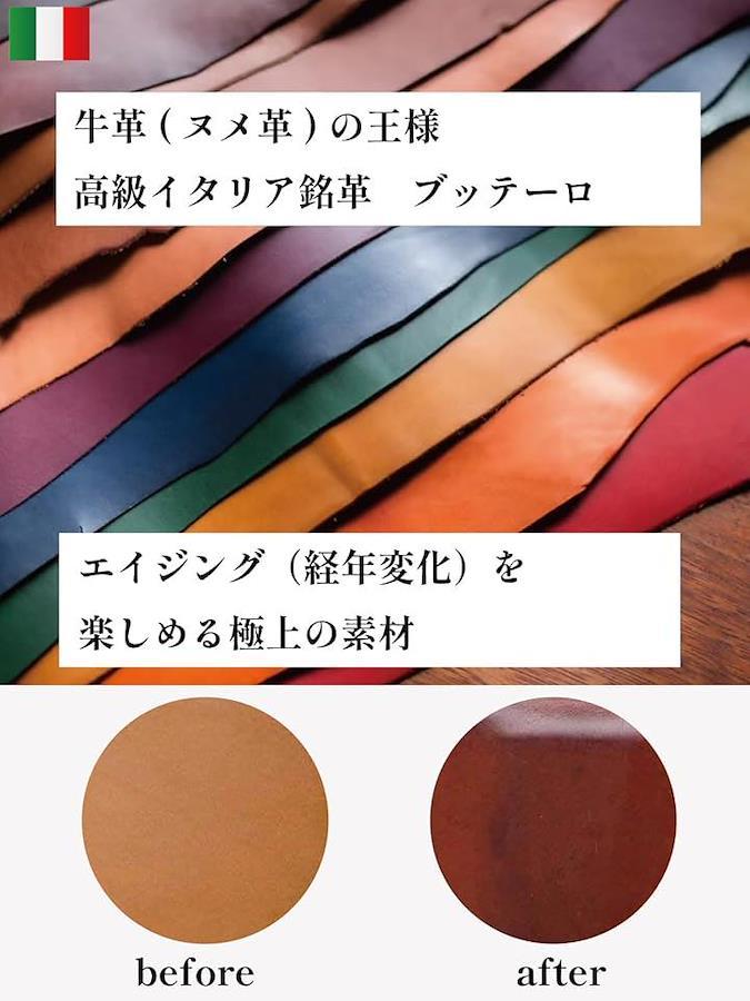 「イタリア銘革ブッテーロを使用」こちらのキーケースは、イタリアの老舗タンナー「ワルピエ社」が製造する高品質なフルベジタブルタンニン鞣し革です。