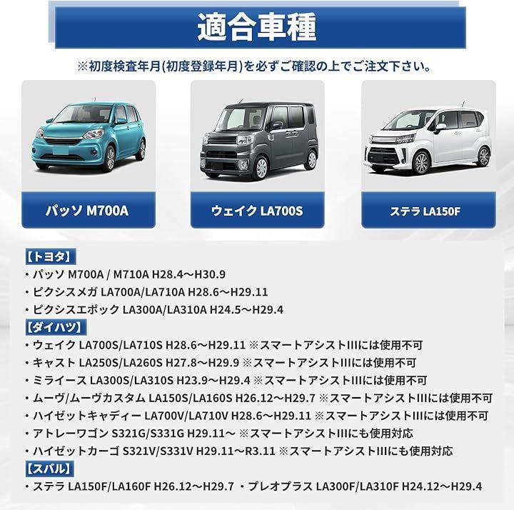 「アイドリングストップ キャンセラー 適合車種」・ダイハツ ムーヴ/ムーヴカスタム H26.12 ~29.7(LA150S/LA160S)・ダイハツ アトレーフゴン H29.11~ R3.11 (S321G/s331G)・スバル ステラ H26.12 ~ 29.7 (LA150F/LA160F)・ダイハツ ハイゼットキャディ H28.6~29.11(LA700V/LA710V)・ダイハツ ハイゼットカーゴ H29.11~ R3.11(S321V/s331V)[スマートアシストIIIにも使用対応]・スバル プレオプラス H24.12 ~ 29.4 (LA300F/LA310F)*初度検査年月(初度登録年月)を必ずご確認の上でご注文下さい。