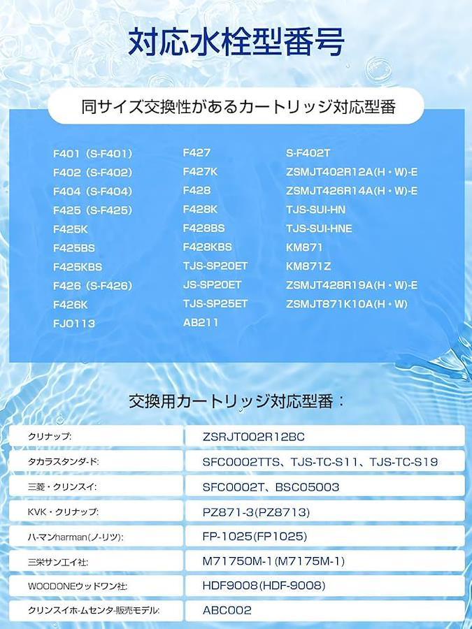 「幅広い適合水栓型番」:F401(S-F401)、F402(S-F402)、F404(S-F404)、F425(S-F425)、F425K、F425BS、F425KBS、F426(S-F426)、F426K、F427、F427K、F428、F428K、F428BS、F428KBS、S-F402T、ZSMJT402R12A(H・W)-E、ZSMJT426R14A(H・W)-E、ZSMJT428R19A(H・W)-E、ZSMJT871K10A(H・W)-T、TJS-SUI-HN、TJS-SUI-HNE、TJS-SP20E、TJS-SP20ET、TJS-SP25ET、KM871、KM871Z、FJ0113、AB211等。